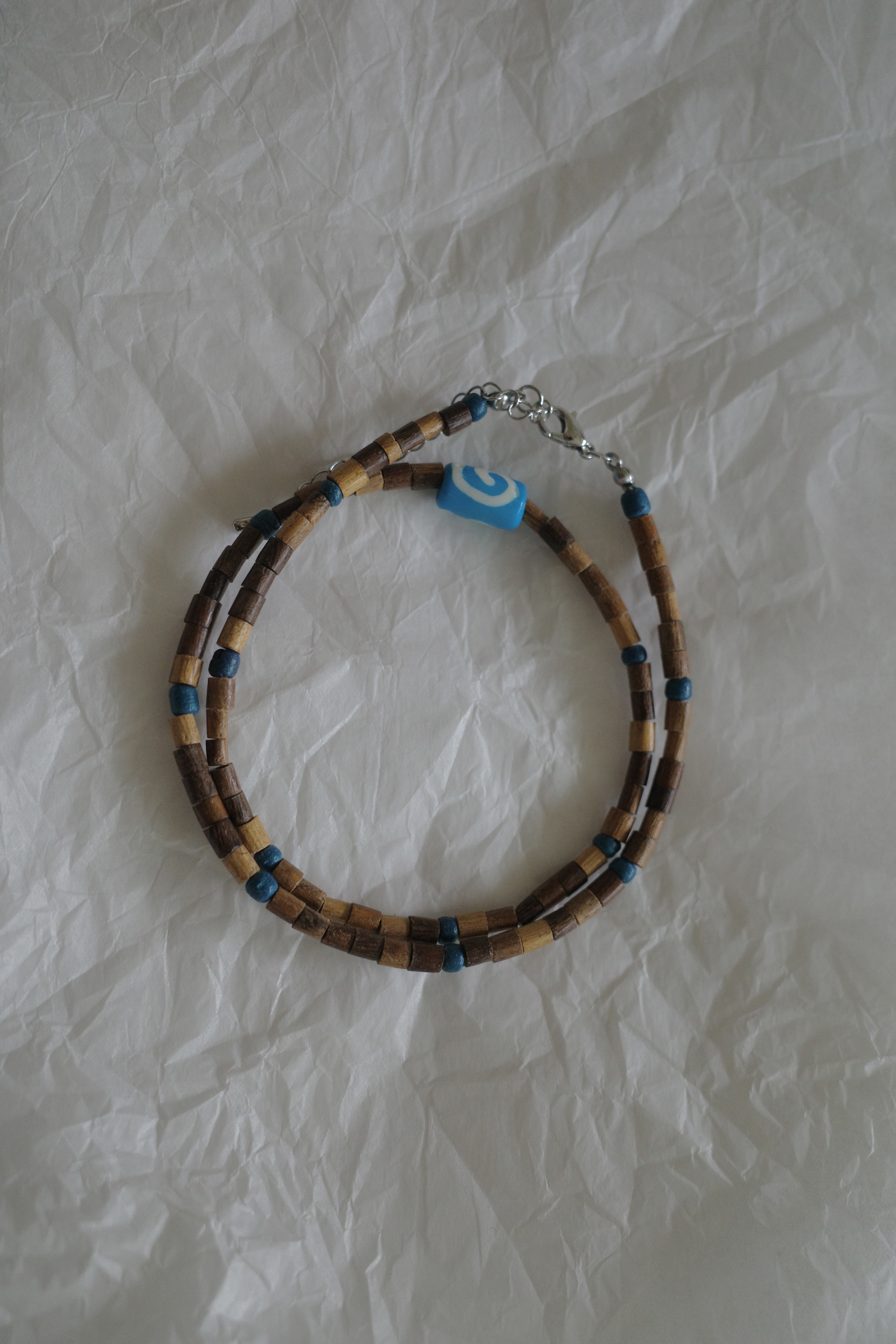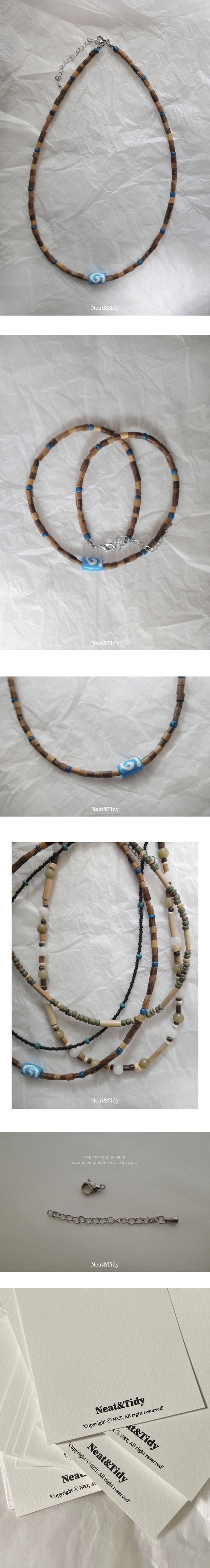 짧은 막대비즈와 중간에 블루 포인트가 들어가서 보헤미안 느낌을 더해주는 목걸이입니다.
