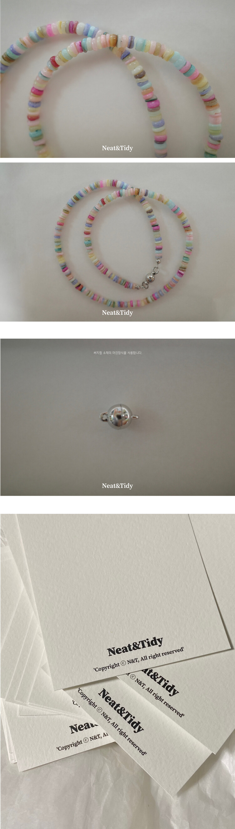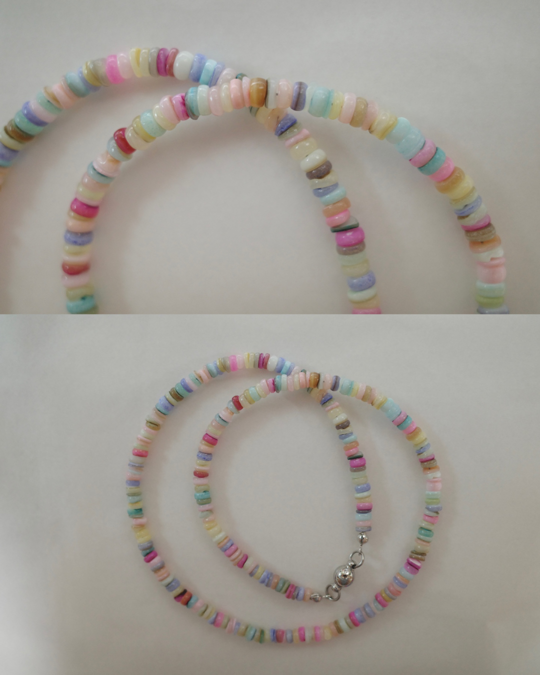 일정하지 않은 불규칙한 형태로 소르베같은 사랑스러운 파스텔 컬러로 조합한 자개 목걸이 입니다.