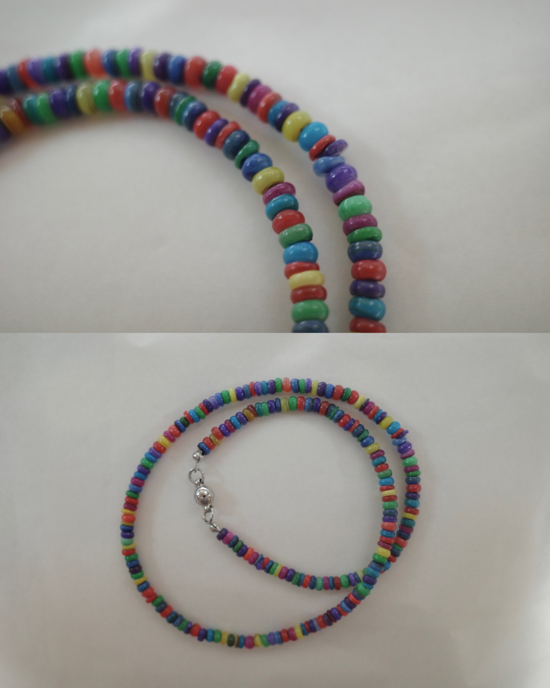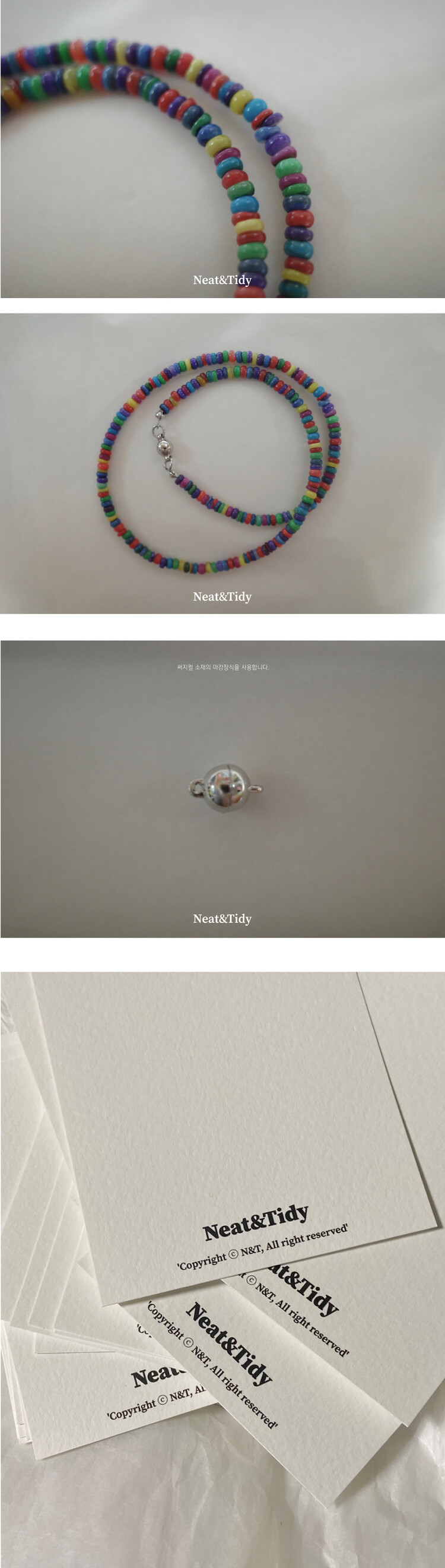 일정하지 않은 불규칙한 형태로 비비드 컬러가 어우러진 자개 목걸이 입니다.